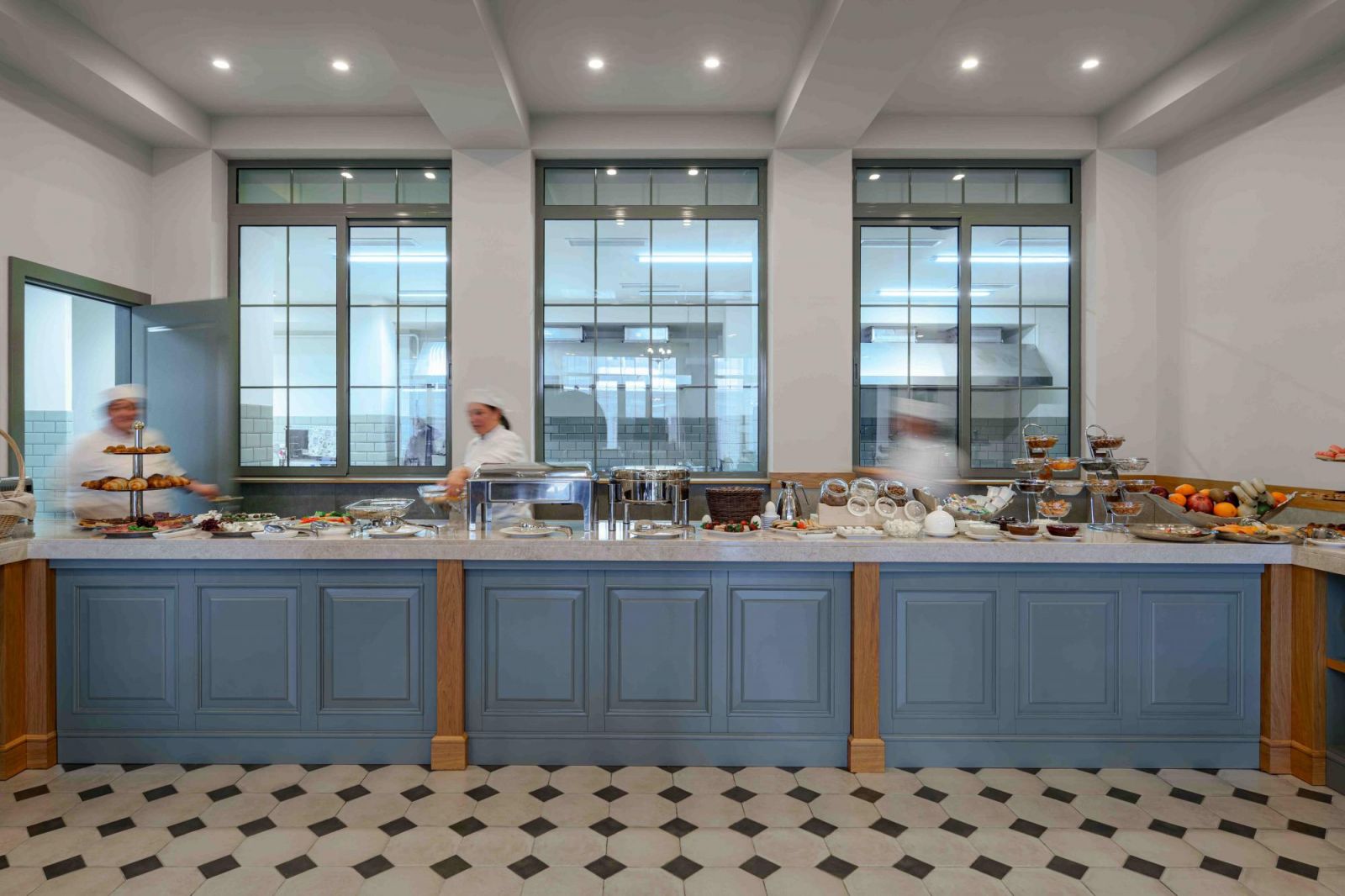 Each morning, visitors can savor a plentiful buffet breakfast featuring hot dishes, fresh pastries, pancakes, cheeses, fruit, and juices, often praised for both quality and variety.